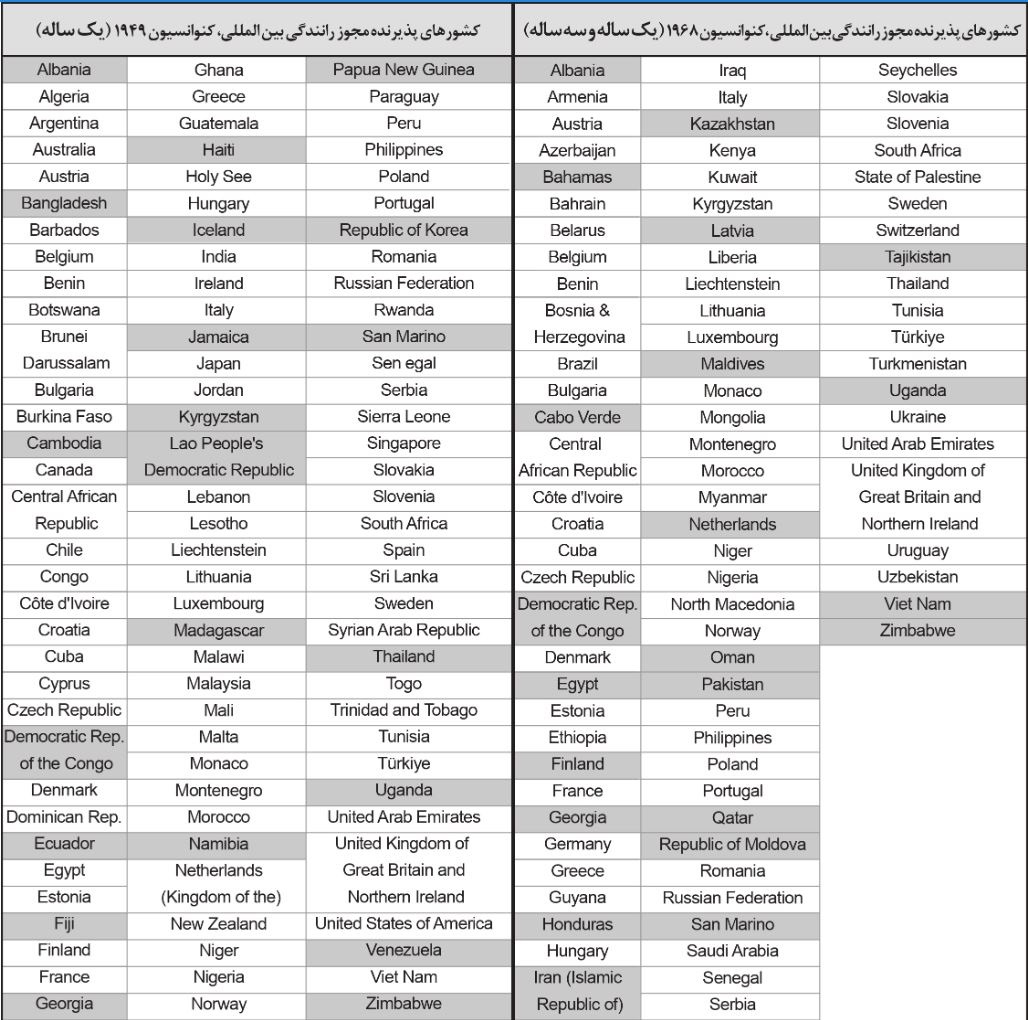 لازم بذکر است گاهی کشورها هردو کنوانسیون (1949ژنو -1968 وین) را مورد قبول دارند اما استثنا این است که مثلا شما در کشورهای حاشیه خلیج فارس تنها با ژنو 1949 اجازه رانندگی با خودرو شخصی را دارید و در 1968وین فقط خودرو اجاره ای میتوانید استفاده کنید.